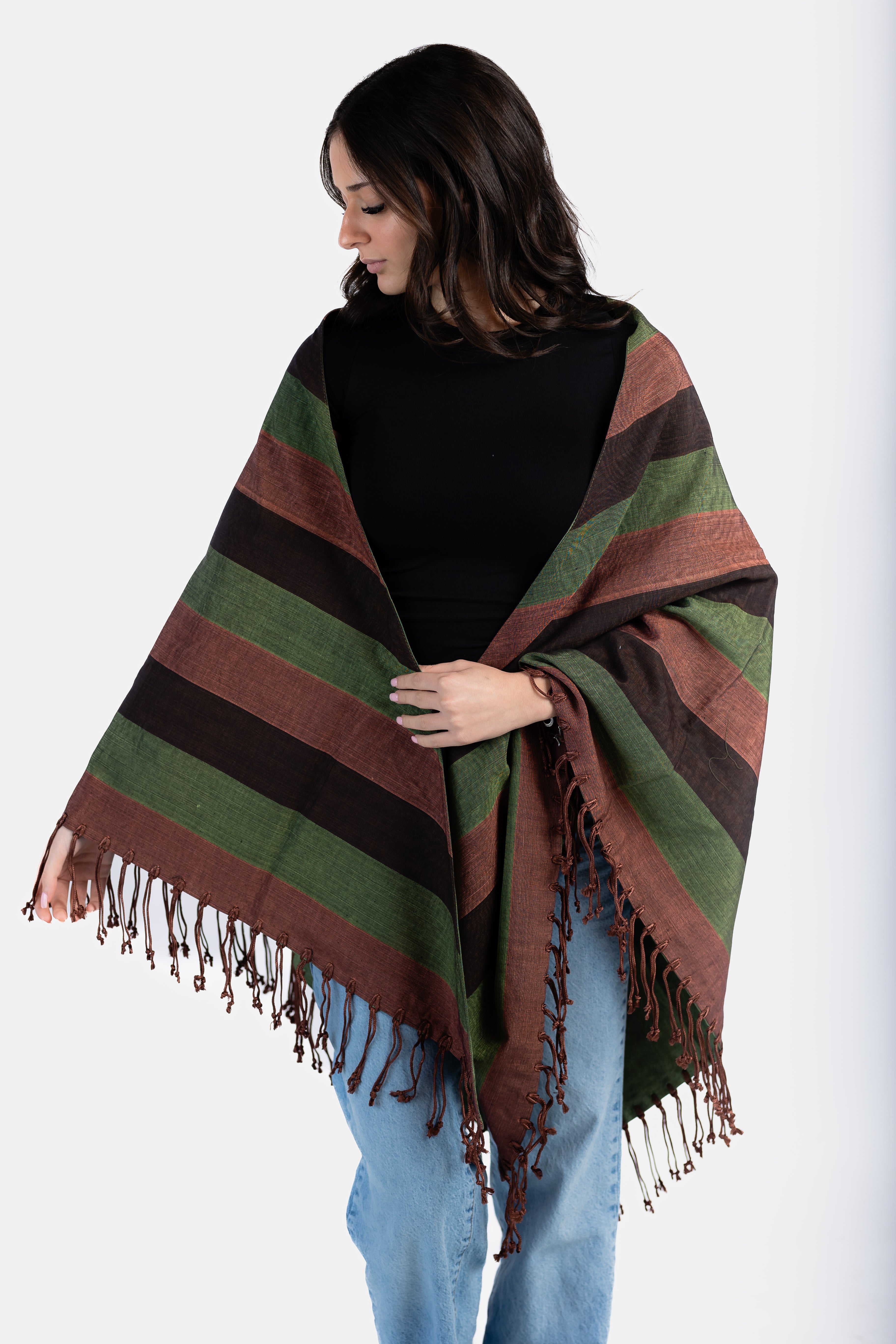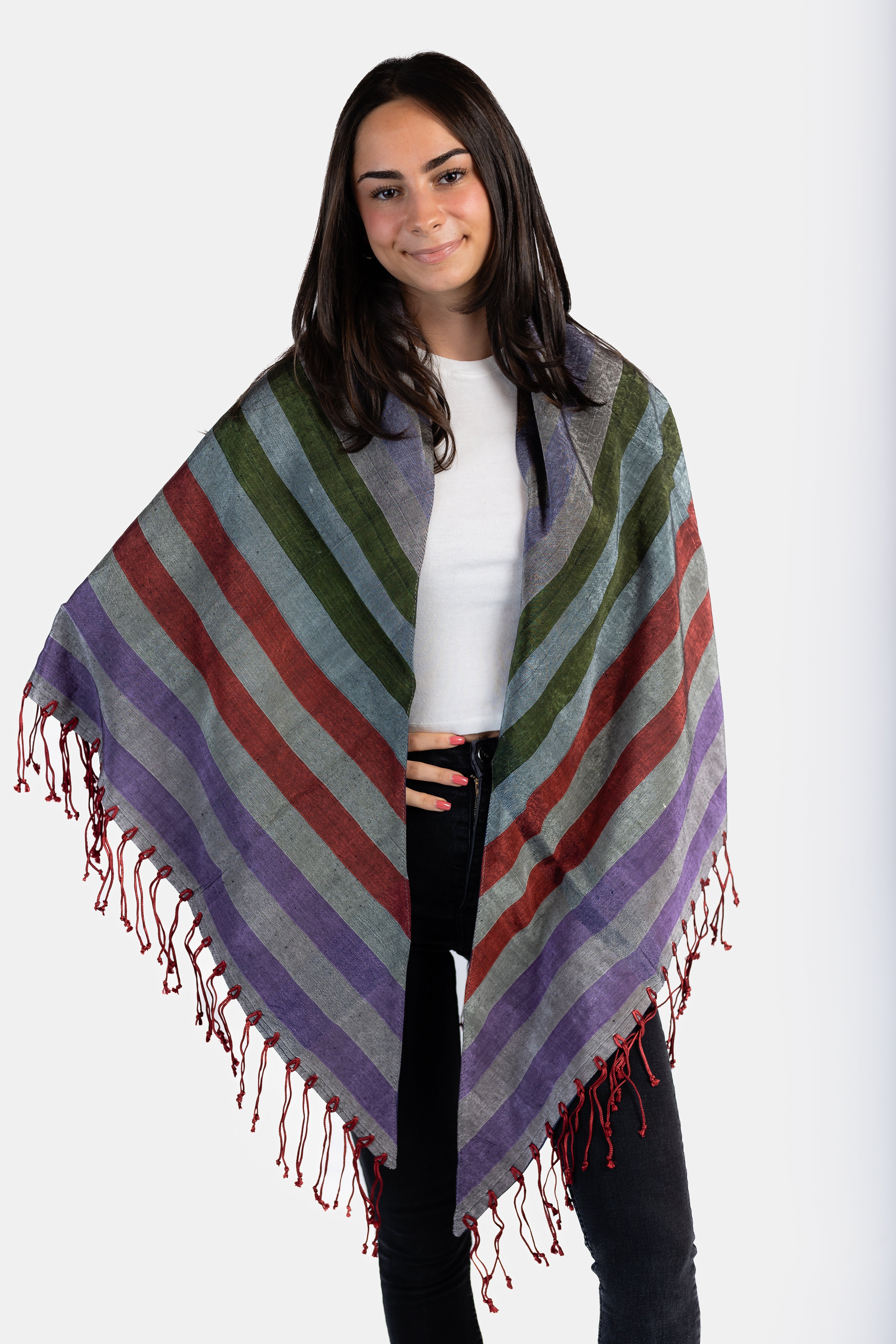 - Elegant shawl crafted of multicoloured, striped moiré and decorated with delicate fringes