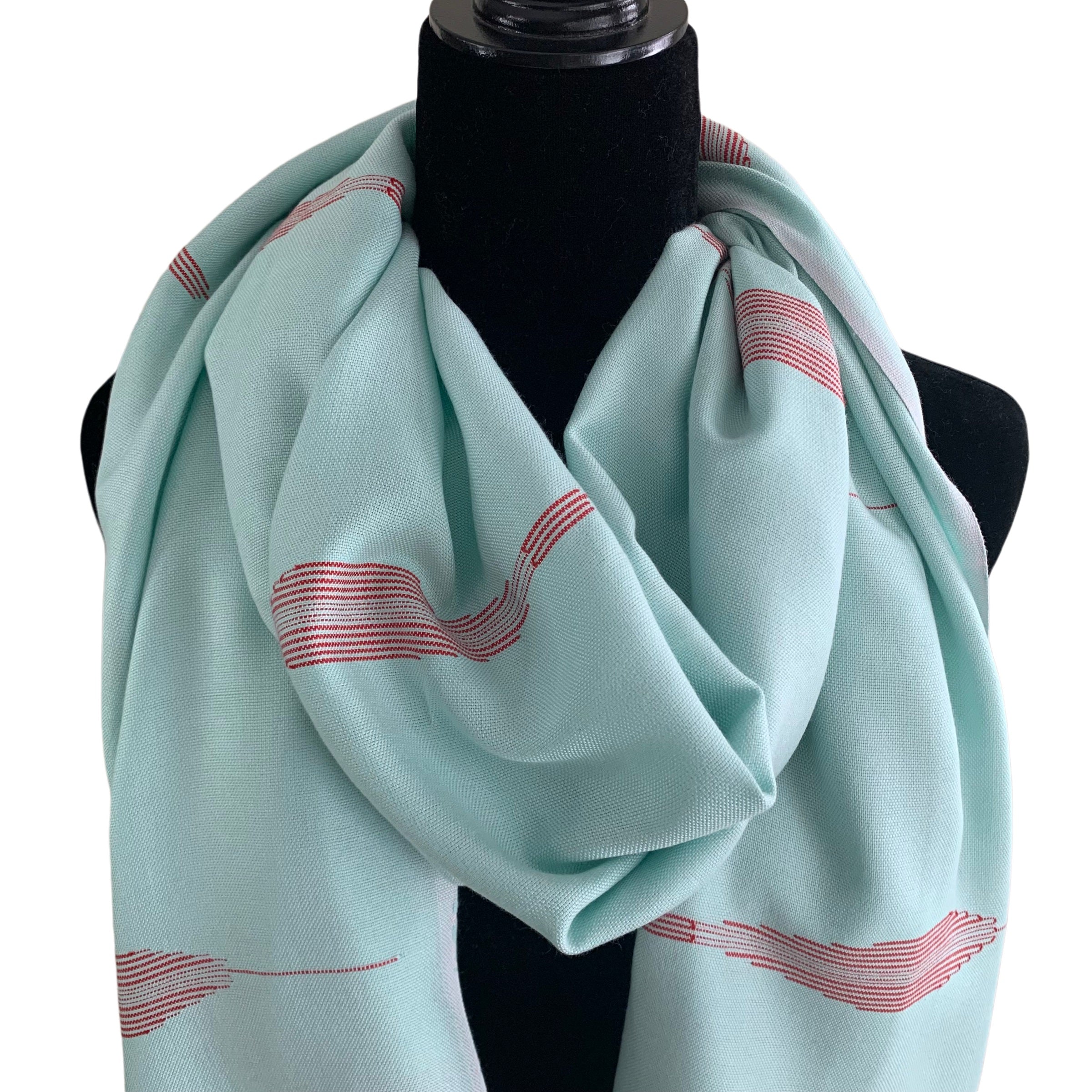 - Fair trade, ethically sourced sky blue & red scarf with delicate fringes on the ends