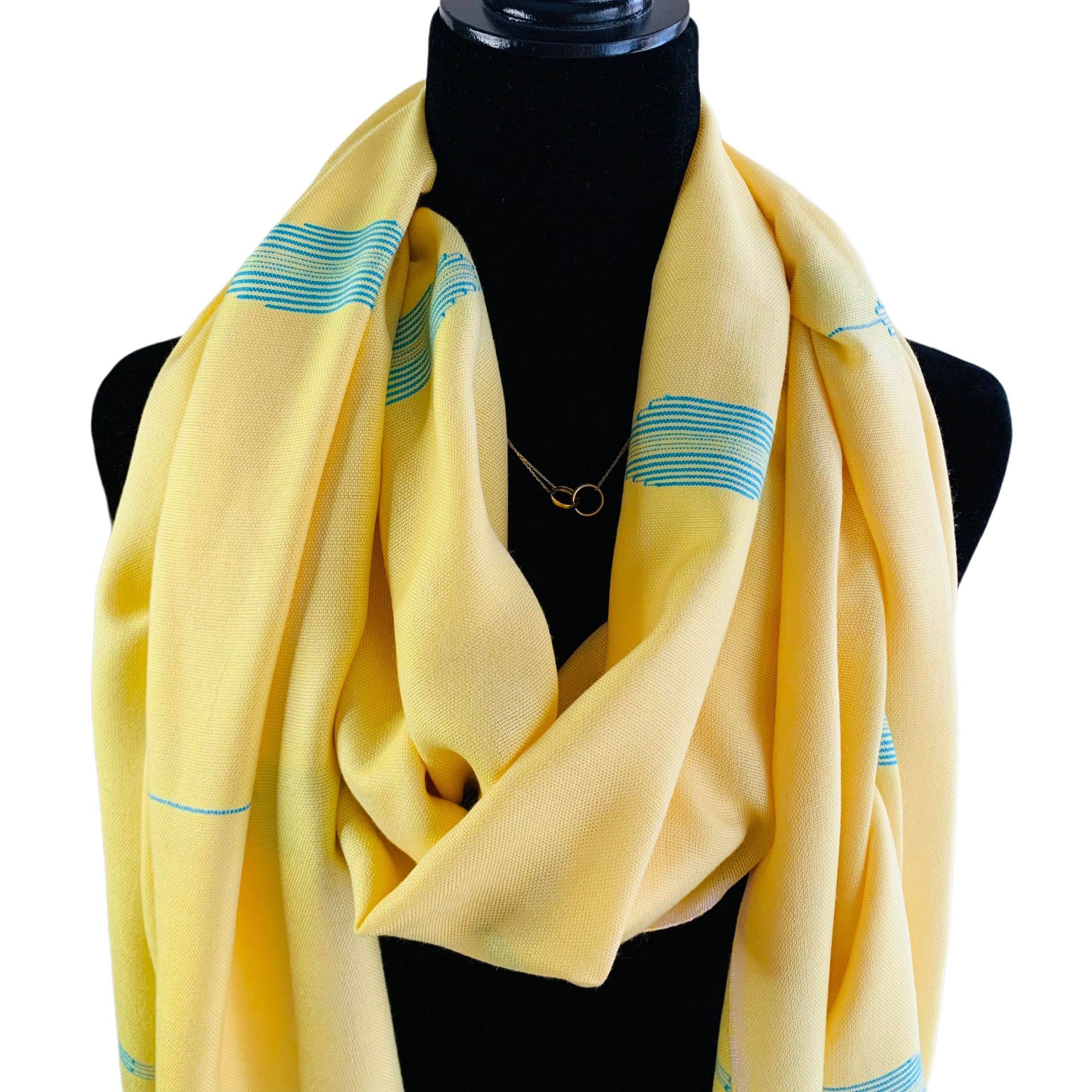- Fair trade, ethically sourced yellow and turquoise scarf with delicate fringes on the ends
