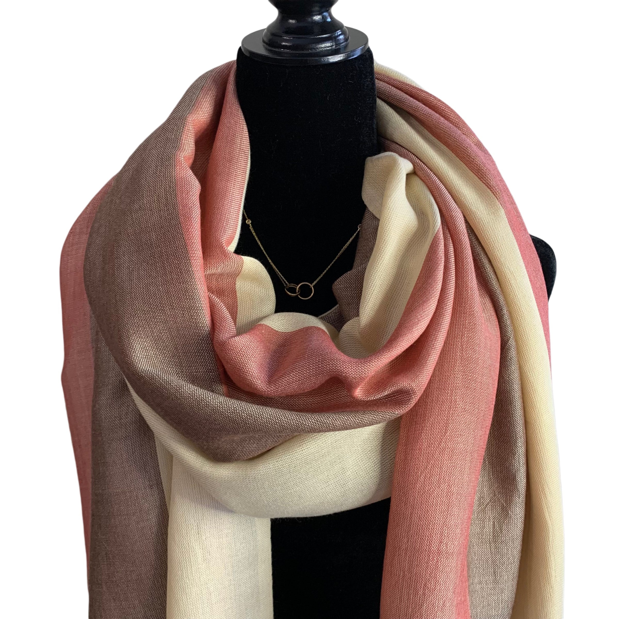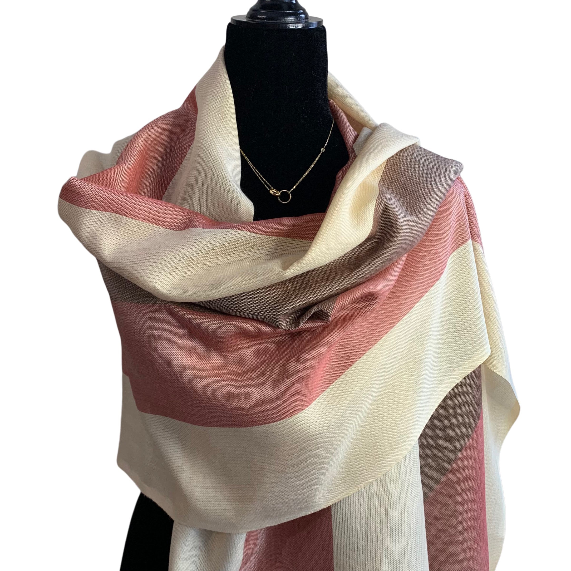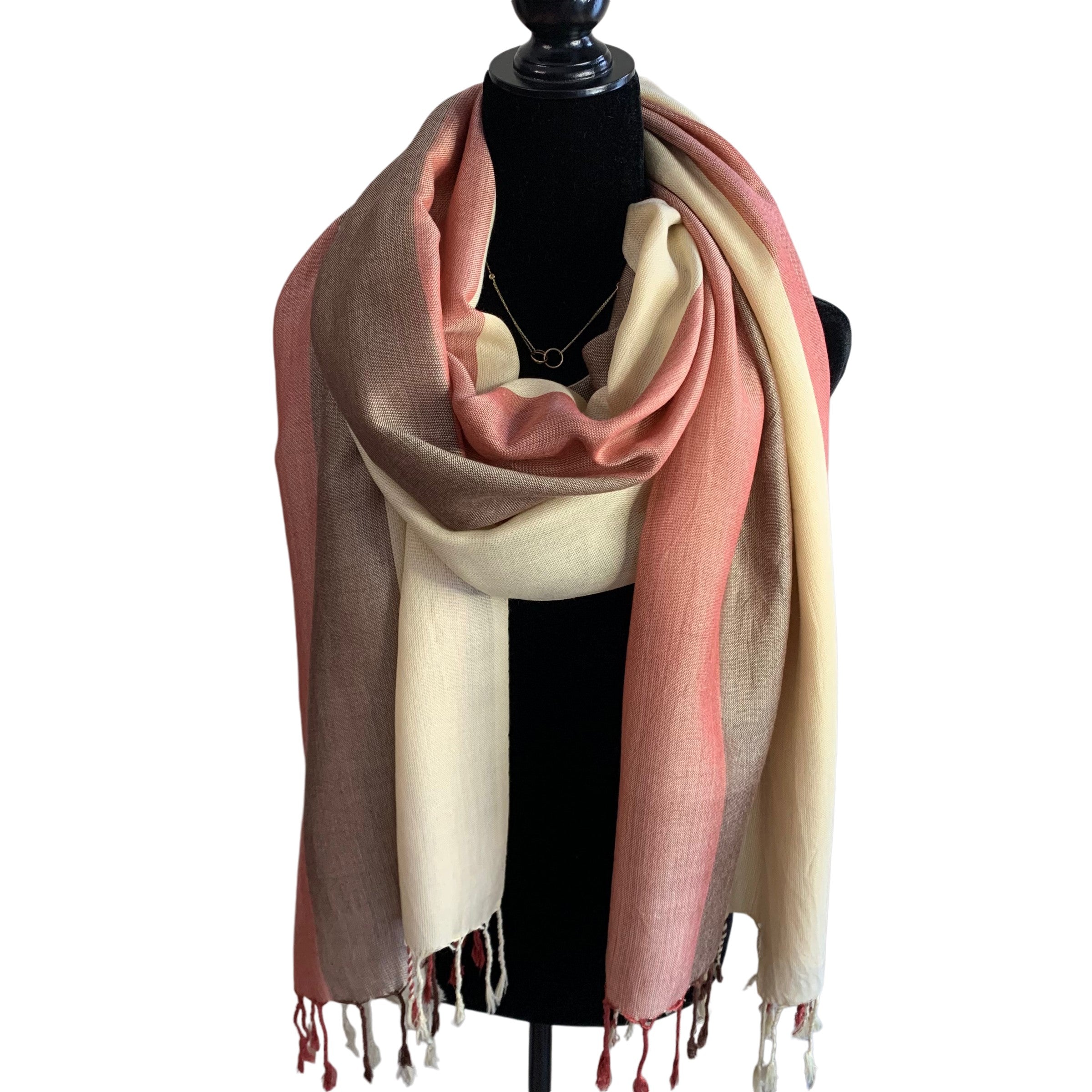 - Fair trade, ethically sourced scarf in multi-coloured wide stripes with delicate fringes on the ends